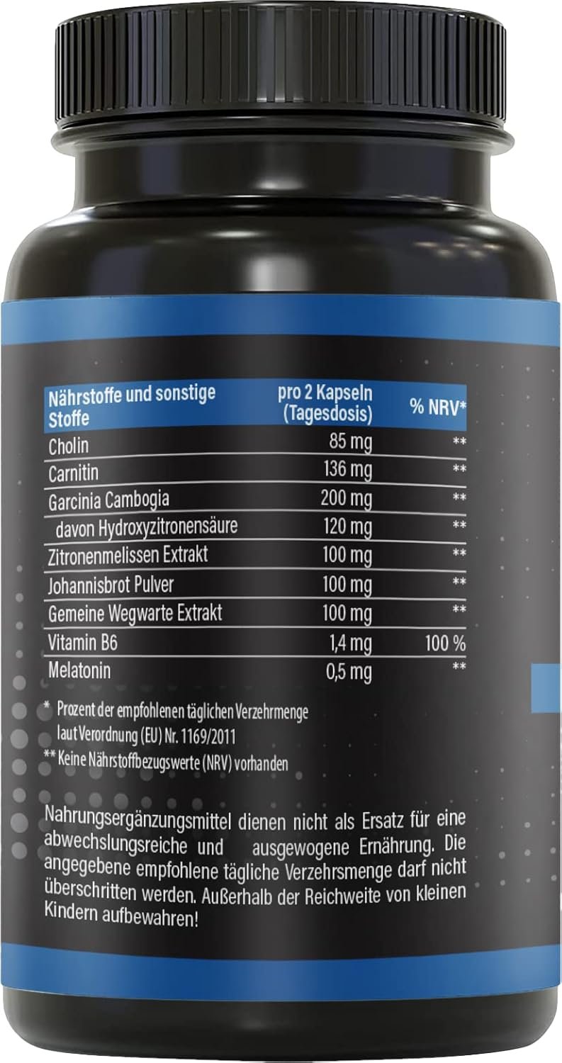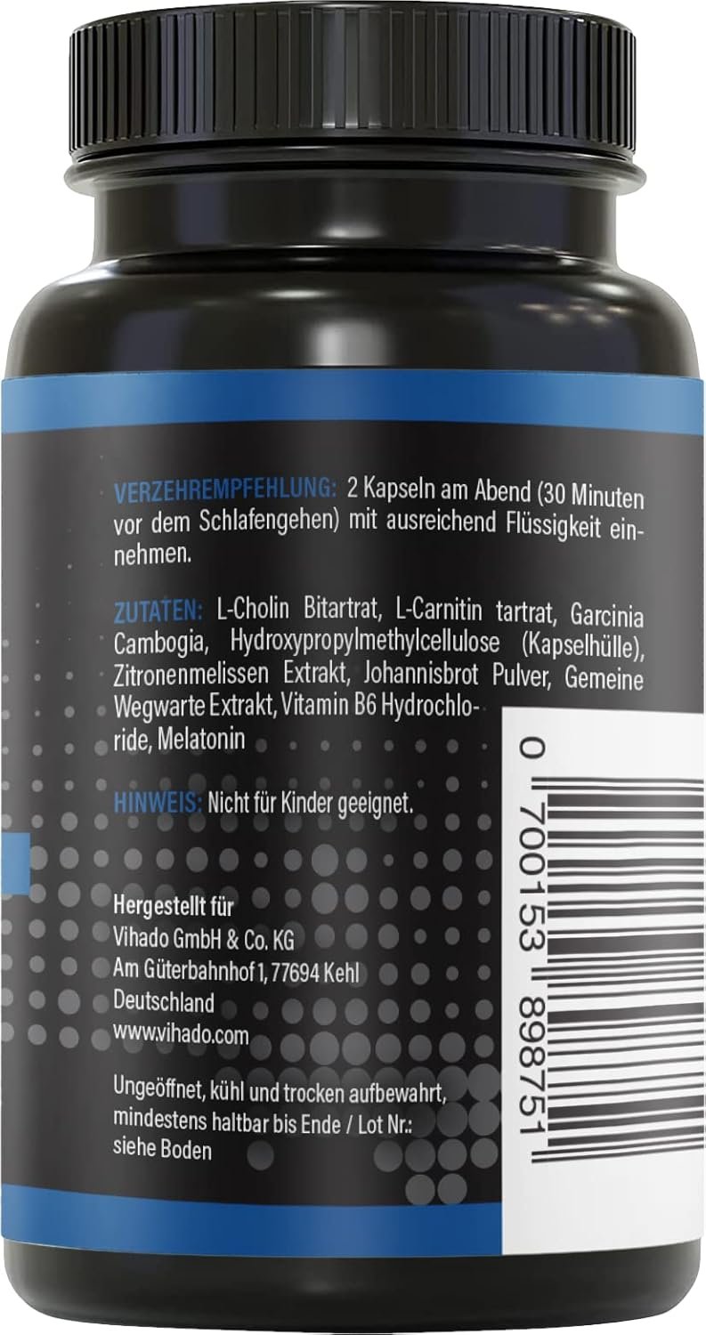 Dublu efect în timpul nopții: susține somnul (melatonină) și metabolismul (L‑carnitină, colină, B6)
