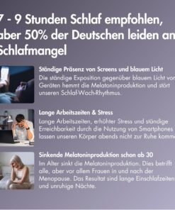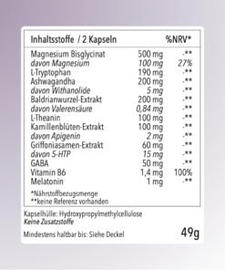 Aceste pastile pentru dormit combină 0,5–1 mg melatonină, magneziu bisglicinat, L-tryptofan și GABA cu ashwagandha, valeriană, mușețel, L-theanină și vitamina B6 – un complex natural pentru un somn profund, somn odihnitor și regenerare fără efecte secundare.