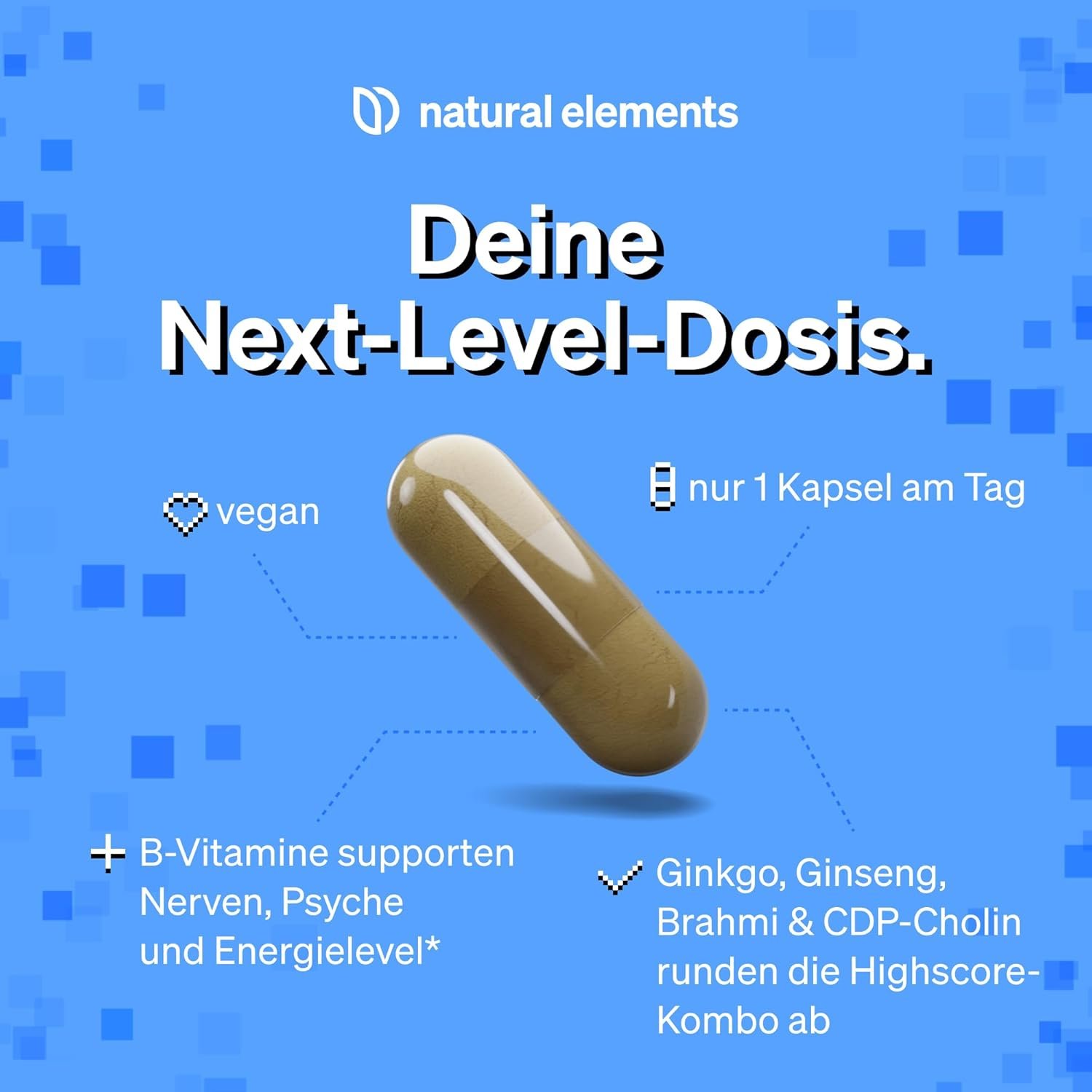 Blend vegan premium cu Brahmi (Bacopa), Ginseng, Ginkgo Biloba – ideal pentru suplimente pentru memorie și supliment pentru concentrare, fără aditivi inutili.