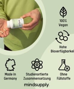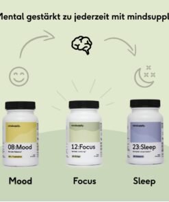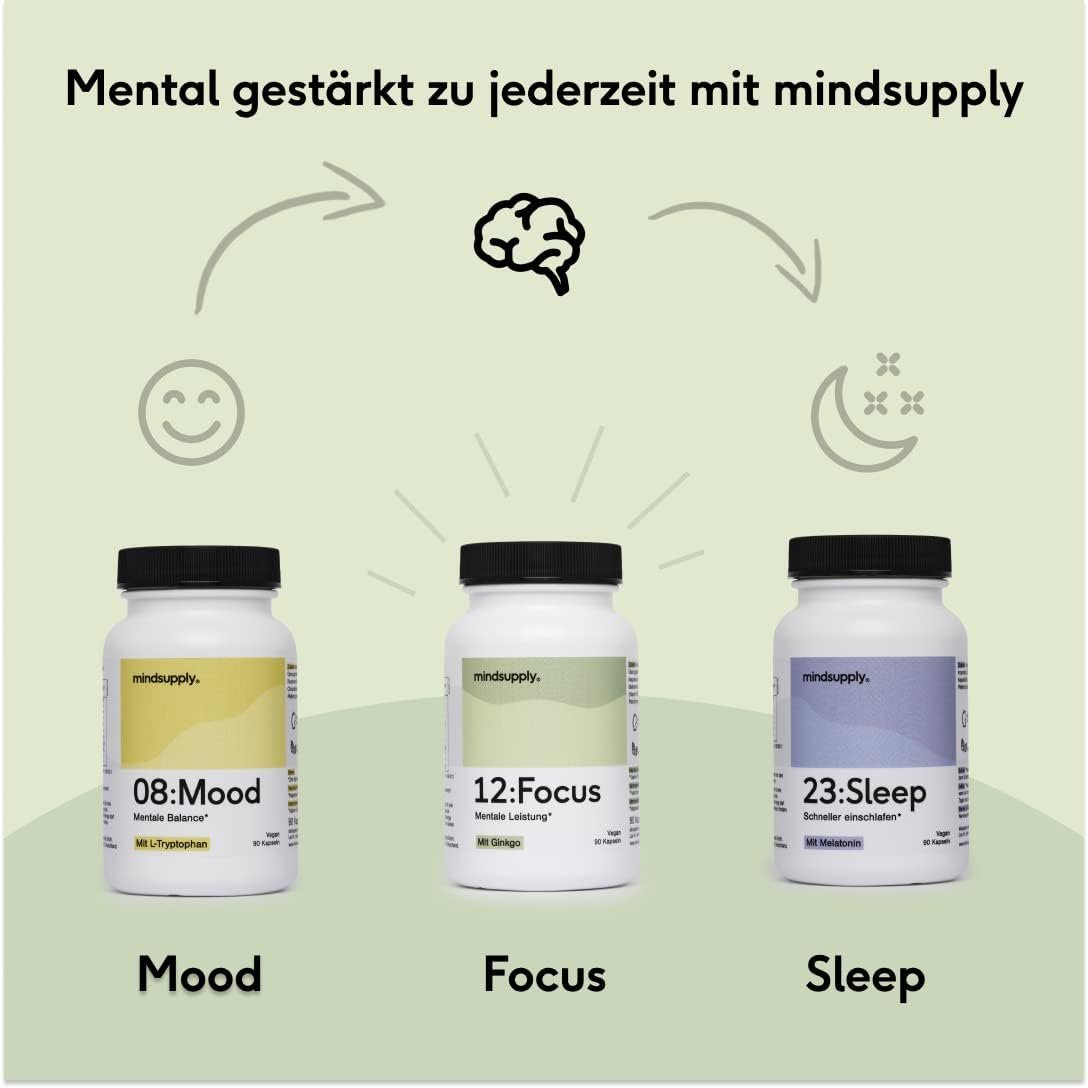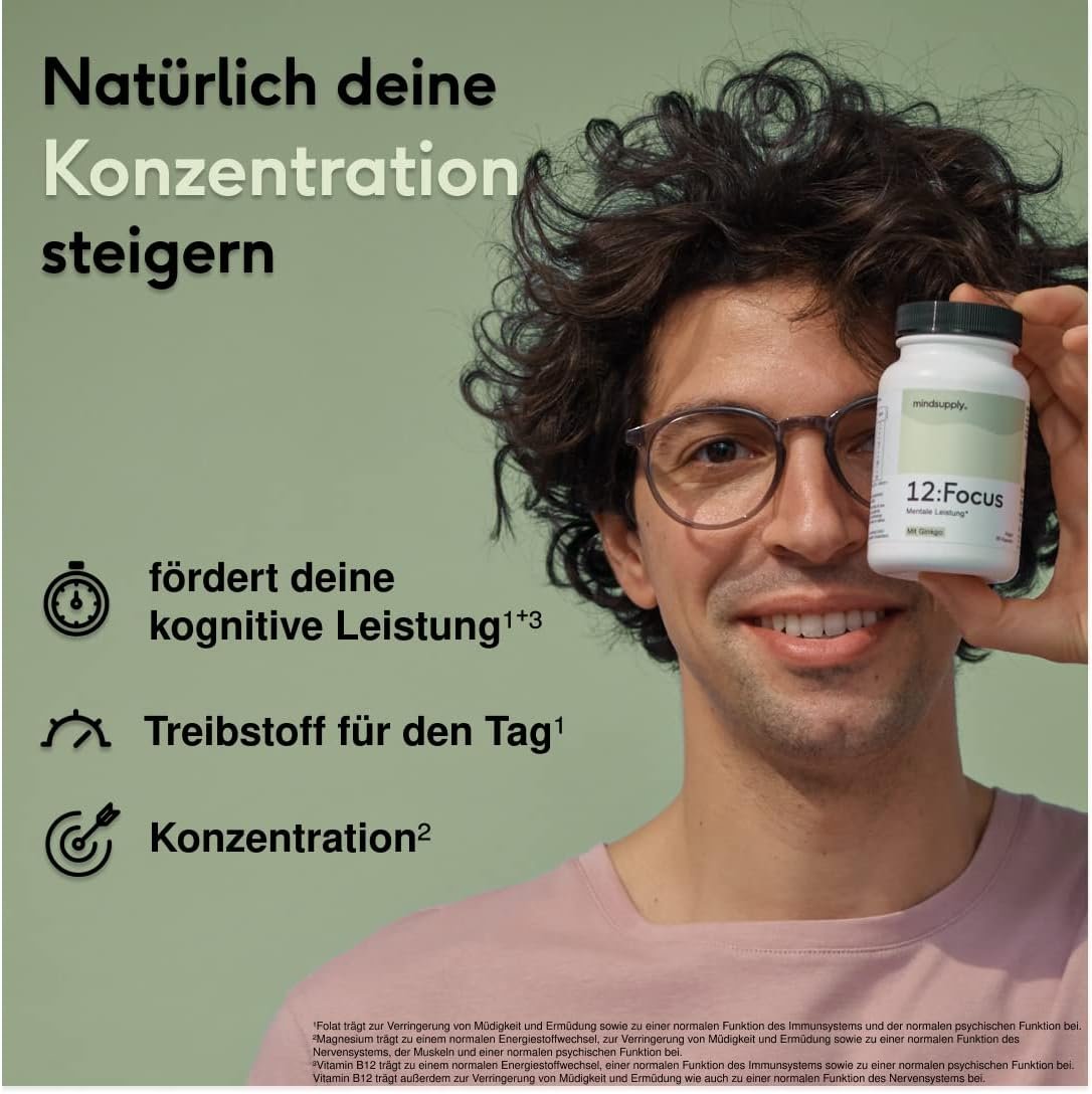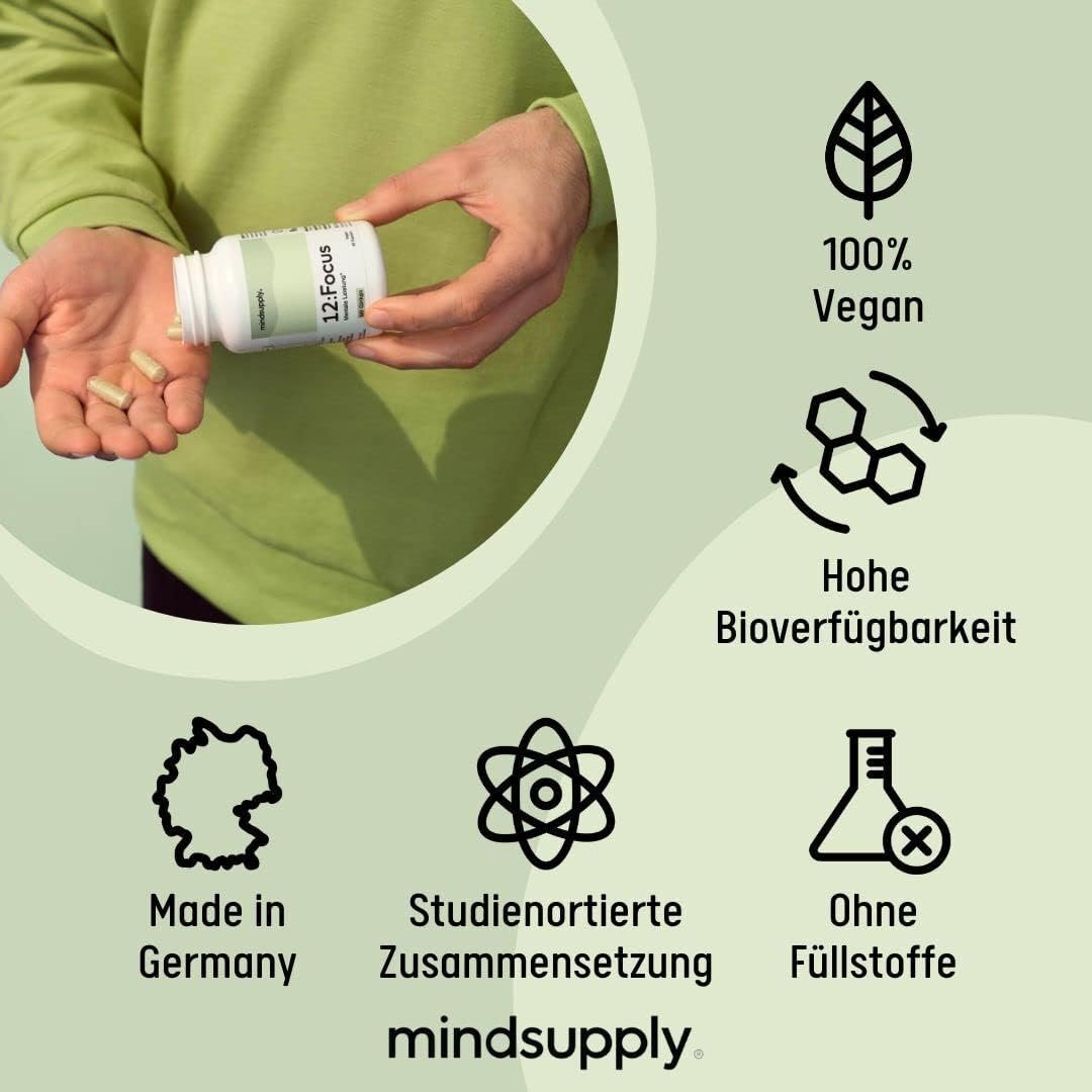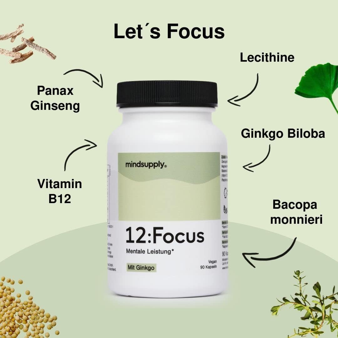 Deschide-ți potențialul mental cu mindsupply Focus – un nootropic premium produs în Germania, fără cofeină. Formula conține extract de Ginkgo Biloba, Panax Ginseng, Bacopa Monnieri (Brahmi), lecitină (fosfolipide esențiale), magneziu, folat și vitamina B12, ingredientele natural dovedite pentru sprijin cognitiv, energie mentală și memorie. Ideal ca vitamine pentru memorie și focalizare, fără gluten sau lactoză.