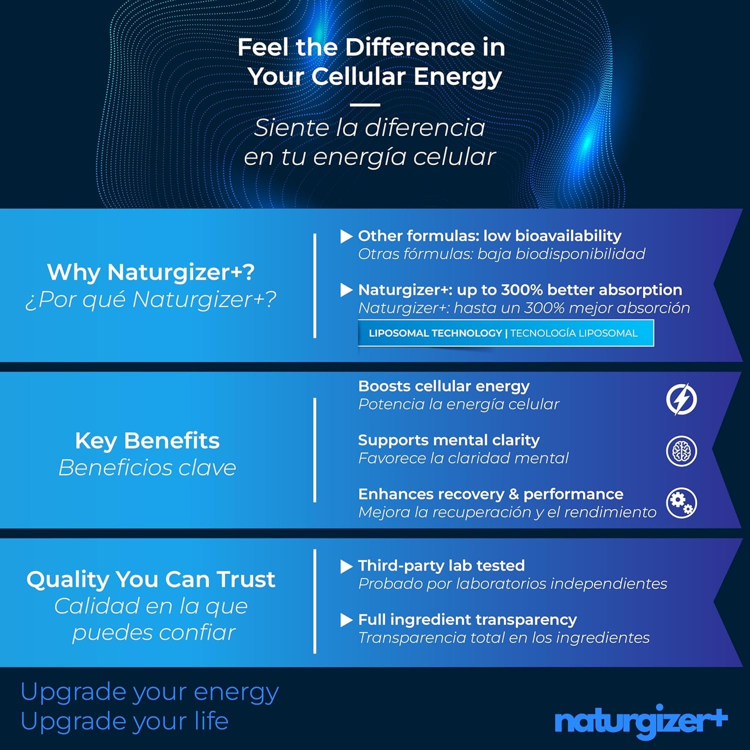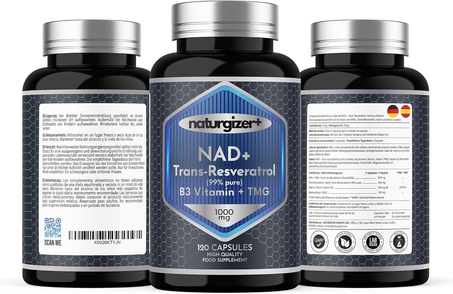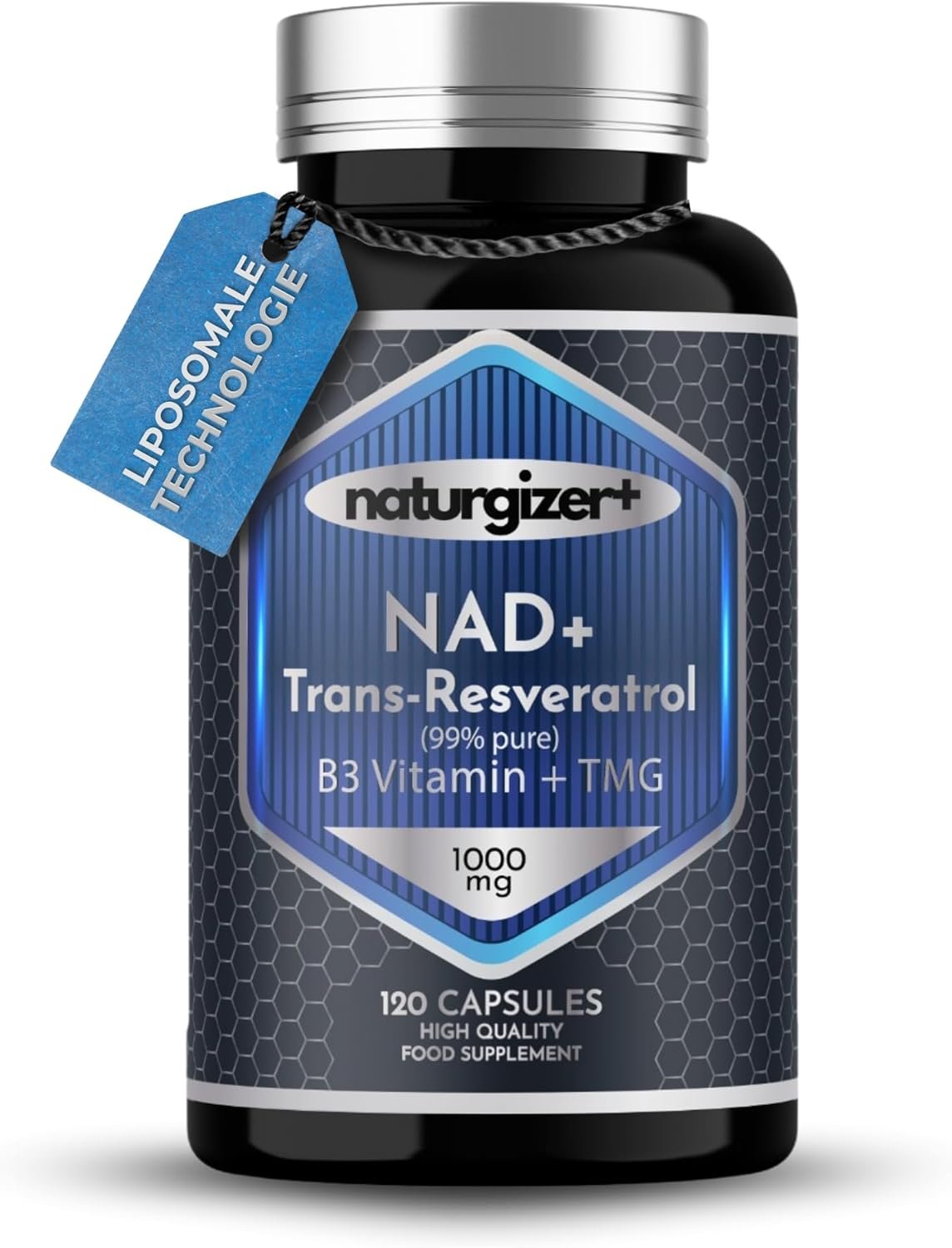 Această formulă avansată conține NAD+ liposomal de puritate foarte înaltă (99,49%), trans-resveratrol pur (99,3%), vitamina B3 (niacinamidă) și TMG (trimetilglicină), oferind o doză totală zilnică de 1000 mg. Sinergia ingredientelor susține funcțiile esențiale ale organismului, de la nivel celular până la starea generală de bine.