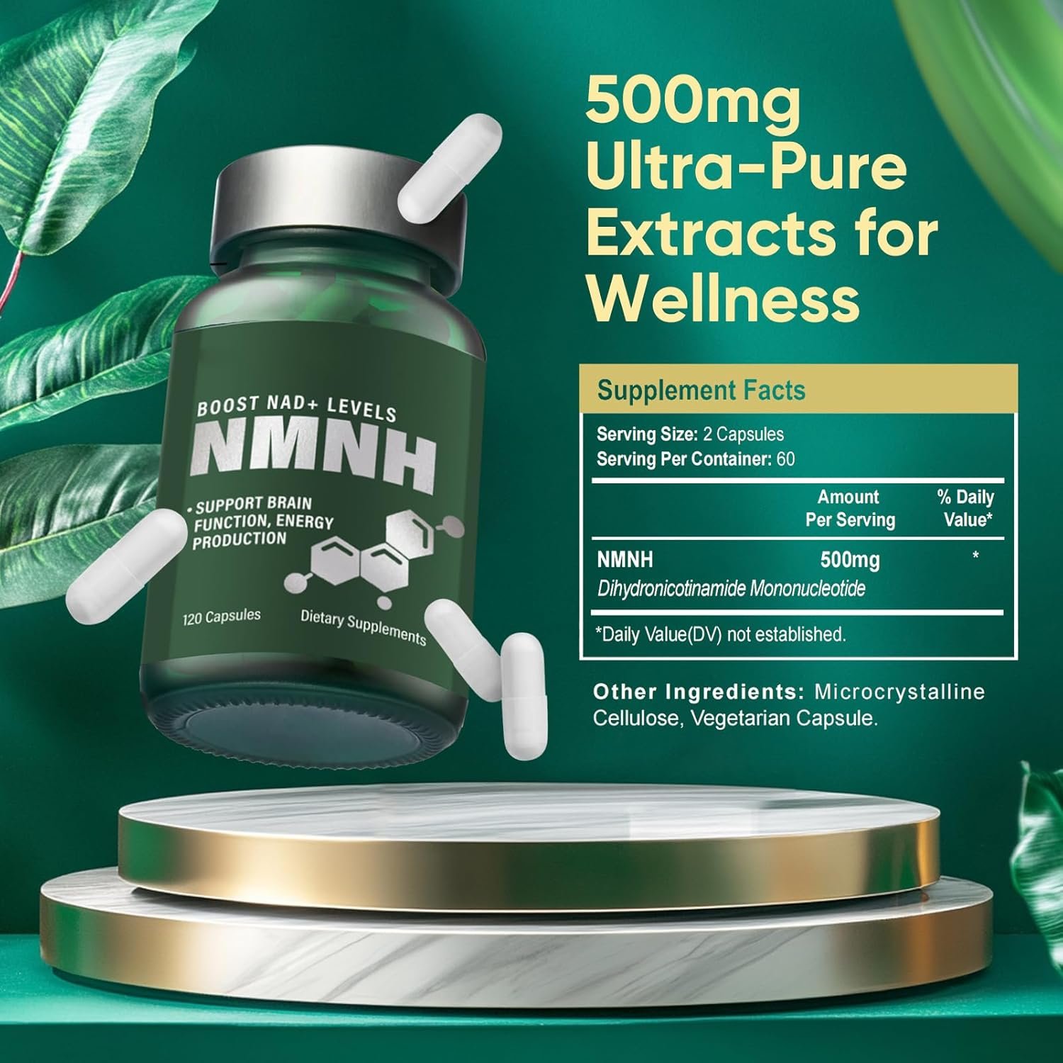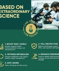 Acest supliment nad+ contine 500mg de NMNH (dihidronicotinamida mononucleotidica) per portie – o forma avansata si stabila de precursor NAD+, esential pentru metabolismul celular, energie naturala si sanatatea creierului. Spre deosebire de formele clasice de supliment nmn, NMNH are o absorbtie mai rapida si o eficienta crescuta in cresterea nivelurilor de NAD+, contribuind la un efect anti-îmbătrânire profund, sustinerea functiei mitocondriale si reducerea stresului oxidativ. Formula este vegana, fara OMG, fara gluten si fara aditivi artificiali – ideala pentru utilizare zilnica in rutina ta de sanatate si longevitate.