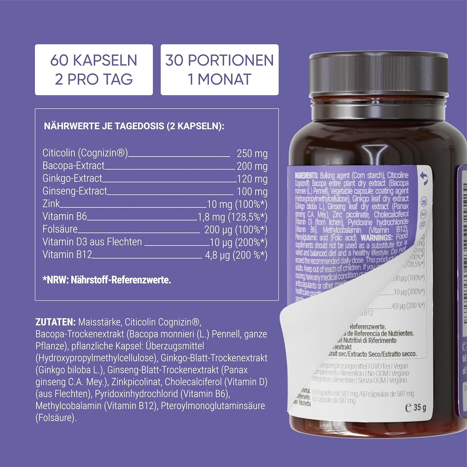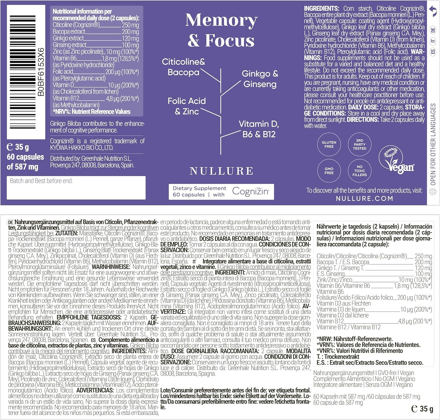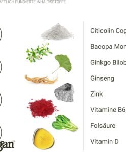 Descoperă acest nootropic premium, creat pentru maximizarea memoriei, concentrării și clarității mentale. Ingredientele includ: Citicolin (Cognizin®), extract uscat de Bacopa Monnieri, Ginkgo Biloba, Panax Ginseng, zinc picolinat, vitamina B6 (piridoxină HCl), acid folinic (folat), vitamina D și vitamina B12 (metilcobalamină). Produsul este vegan, fără cofeină, conservanți sau aditivi – ideal ca vitamine pentru memorie și energie mentală naturală.
