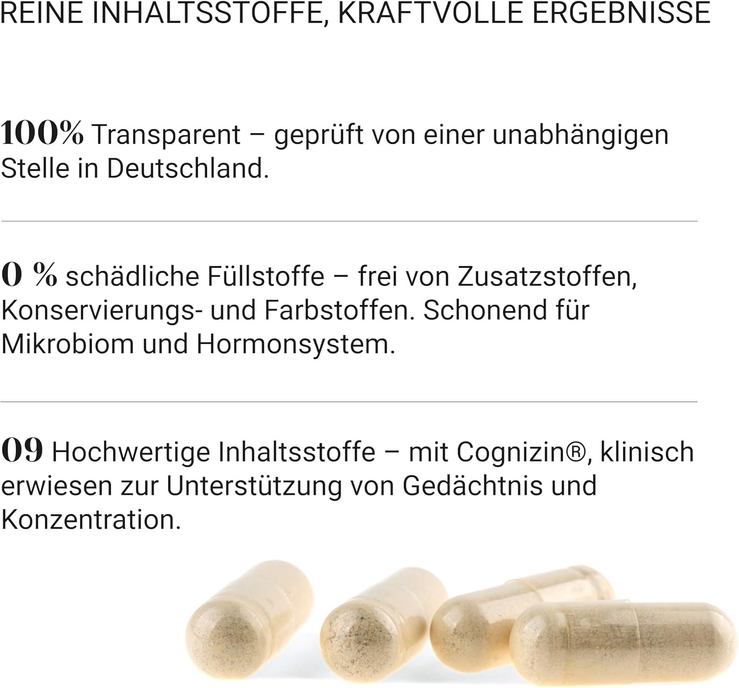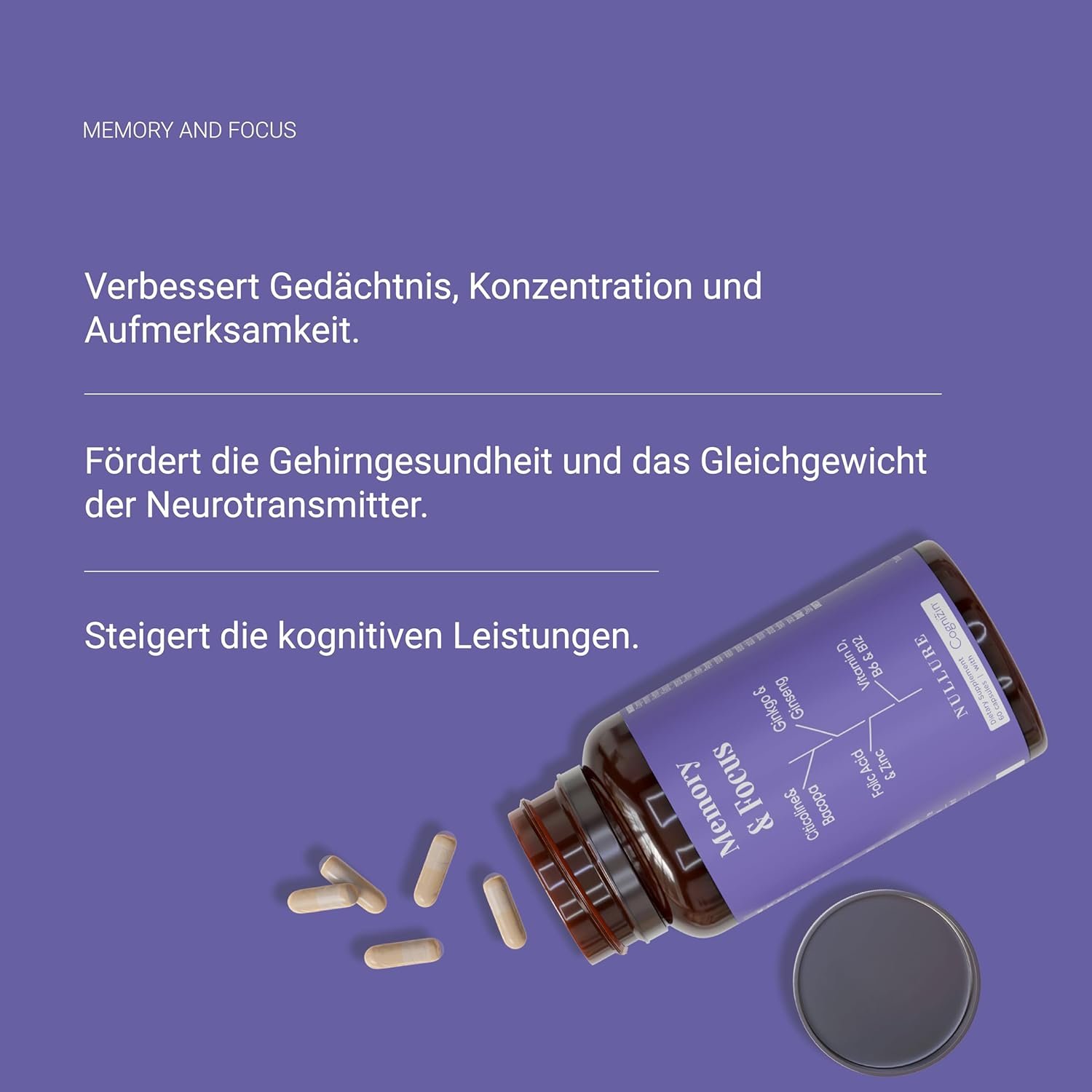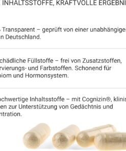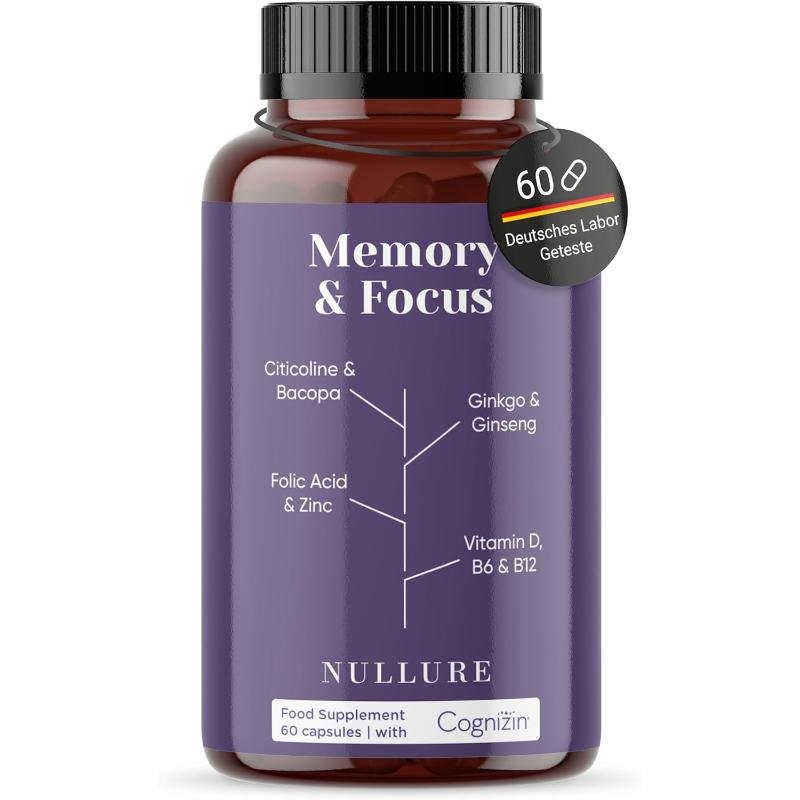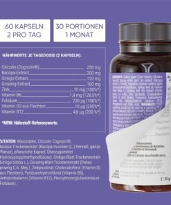 Formula nootropică fără cofeină, cu Citicolin Cognizin®, Bacopa Monnieri, Ginkgo Biloba, Panax Ginseng, Zinc și Vitamine B6/B12/D – susține suplimente memorie, supliment pentru concentrare și atenție sporită.
