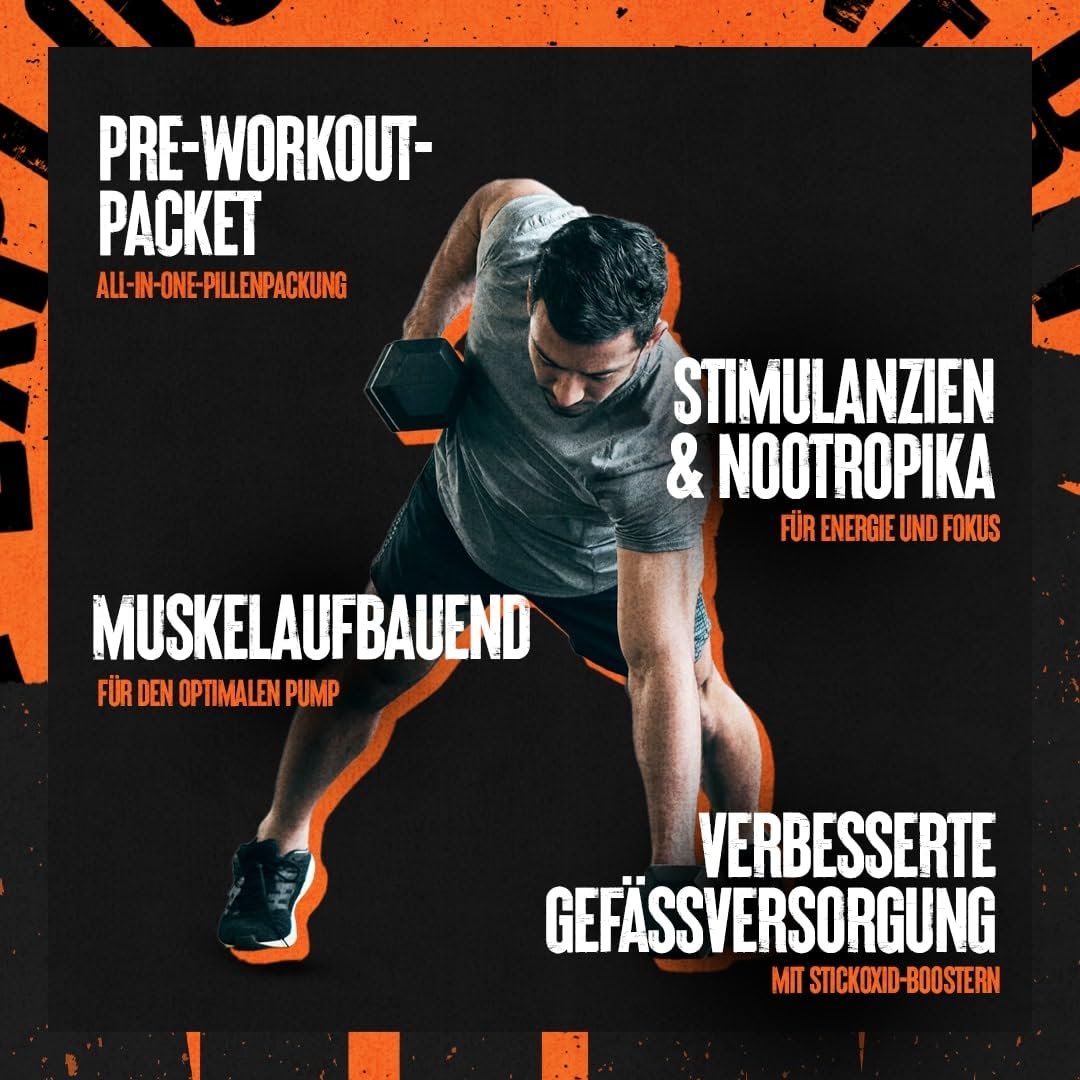Preworkout în pachete convenient capsule, cu complexe de creatină, NO, stimulare, antioxidanti și transport – energie, pompă și focus fără haos.