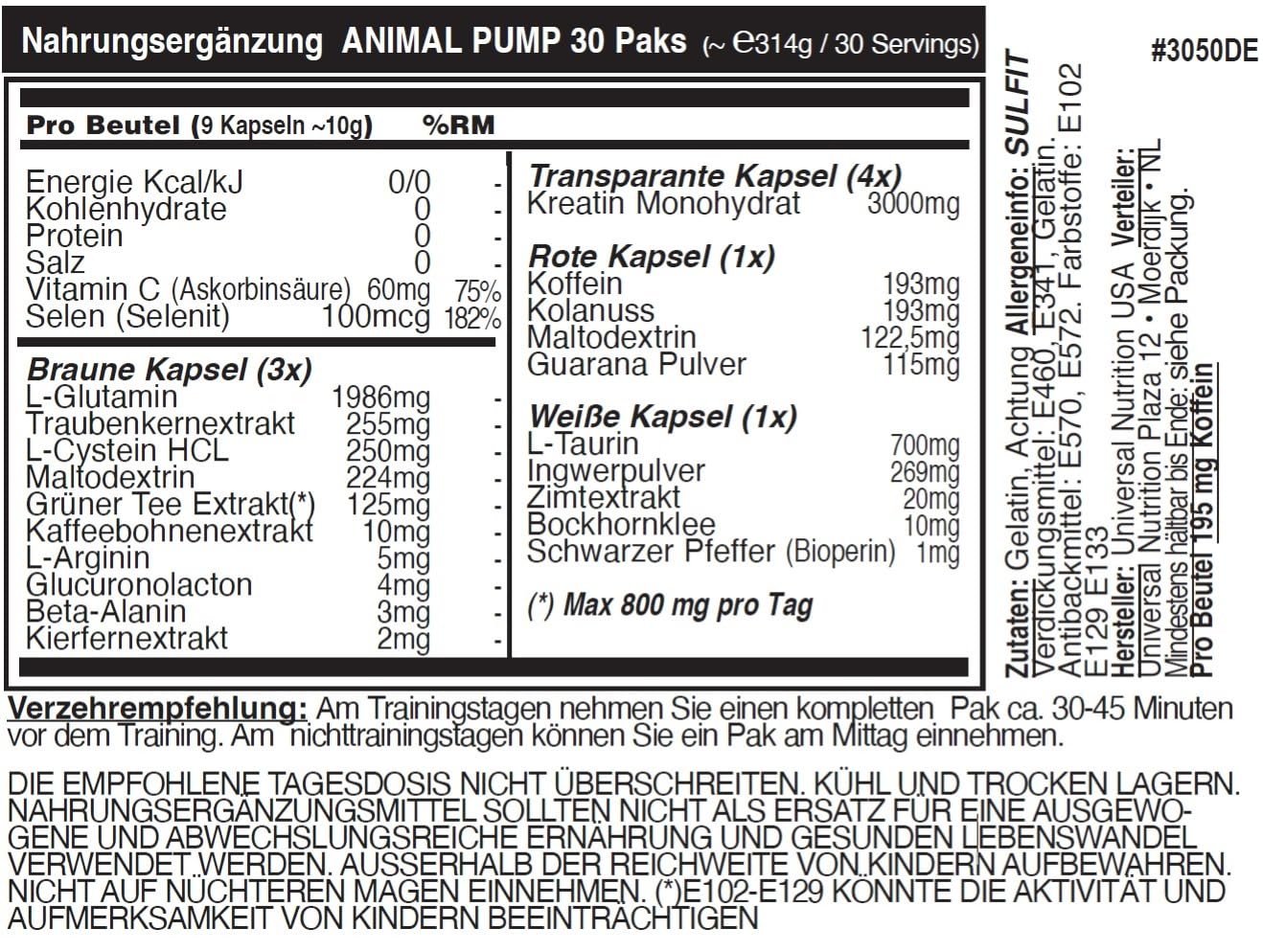 Animal Pump este un preworkout encapsulat complex, cu cinci formule sinergice: creatina (3000 mg creatină monohidrat, chelat și ester) pentru volum muscular, NO Blast cu L‑Arginină AKG, Citrulină Malat, Beta‑Alanina; Energy Rush cu cofeină (193 mg), guarană, theobromină și L‑Tirozină; Antioxidanți (extract de sfeclă, semințe de struguri, ceai verde, acid alfa‑lipolic); Pump Transport (taurină, ghimbir, fenugreek, piper); plus o capsulă roșie stimulatoare opțională – toată forța înainte de antrenament **