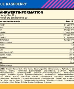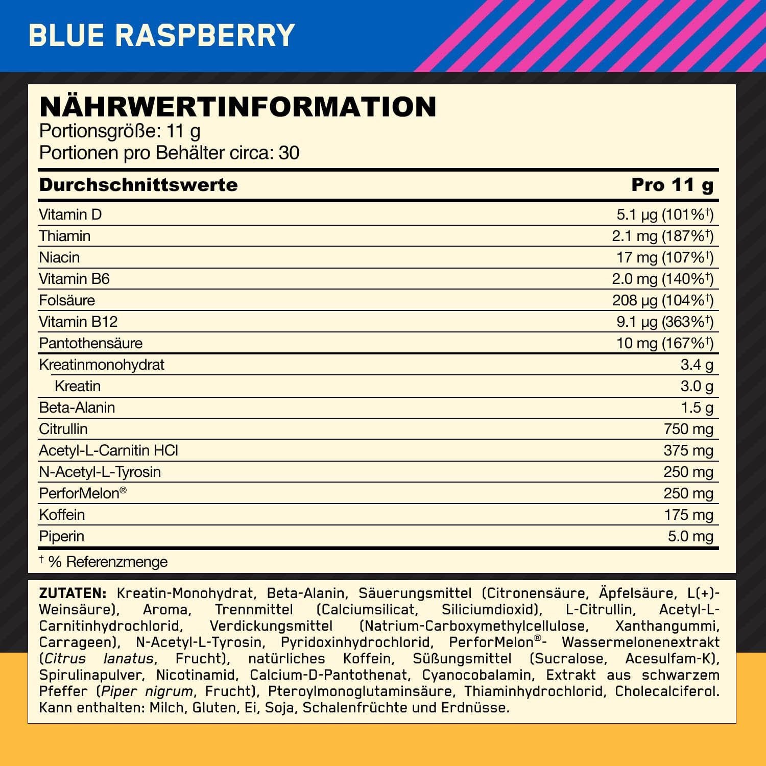 Ingrediente: Creatina Monohidrat, Beta-Alanina, L-Citrulina, Acetil-L-Carnitina-HCl, N-Acetil-L-Tirozina, extract de pepene verde, cofeina naturala, spirulina, extract de piper negru, vitamina B6, B12, niacina, acid folic, tiamina, vitamina D, arome, acid citric, acid malic, agenti antiaglomeranti, indulcitori (sucraloza, acesulfam K).