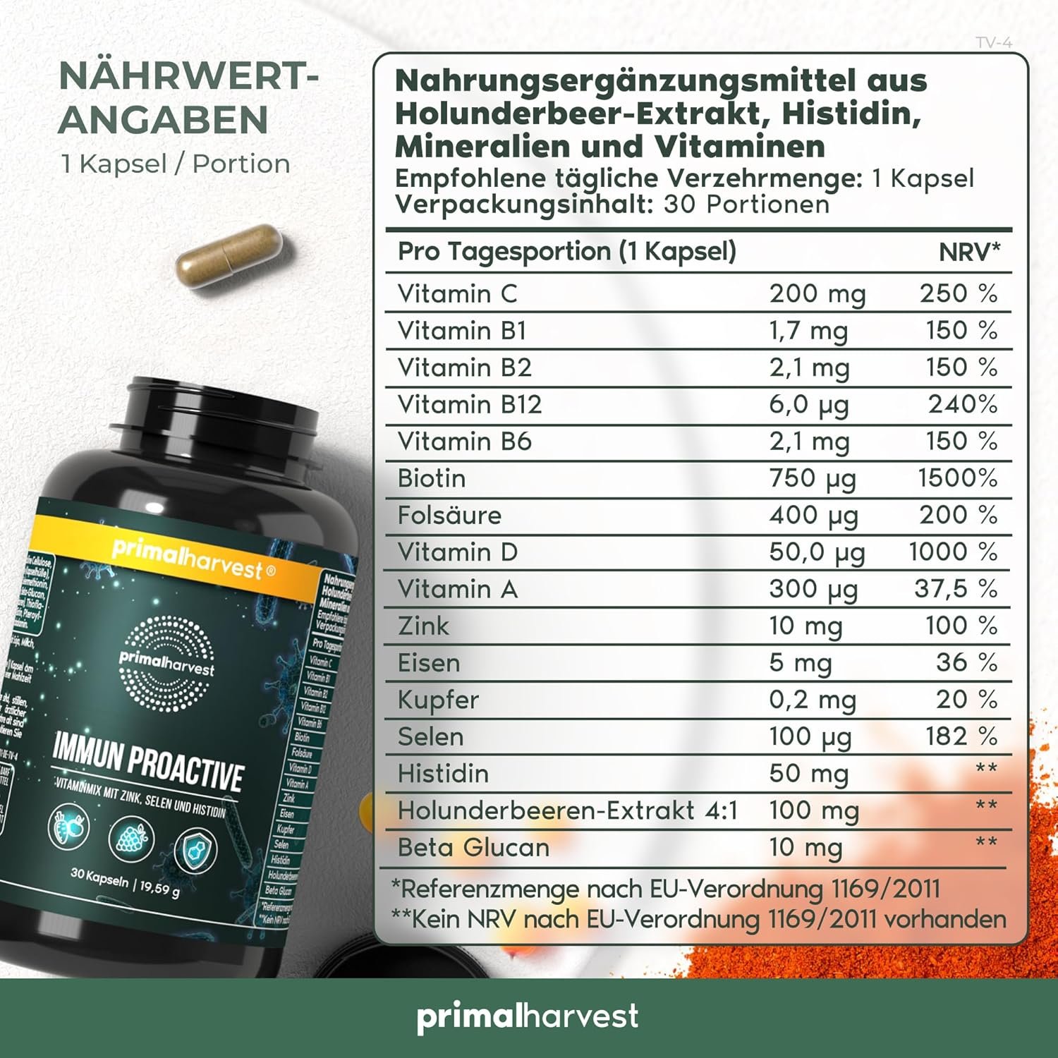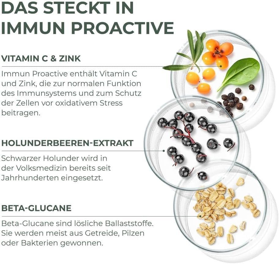 Elderberry extract (Sambucus nigra), Beta‑1,3/1,6‑glucan, Vitamine: A, C, D3, B12; Minerale: zinc, seleniu. Vegan, formulă fără gluten, lactoză, OMG .