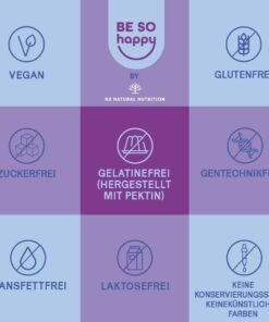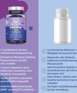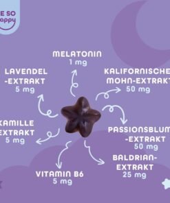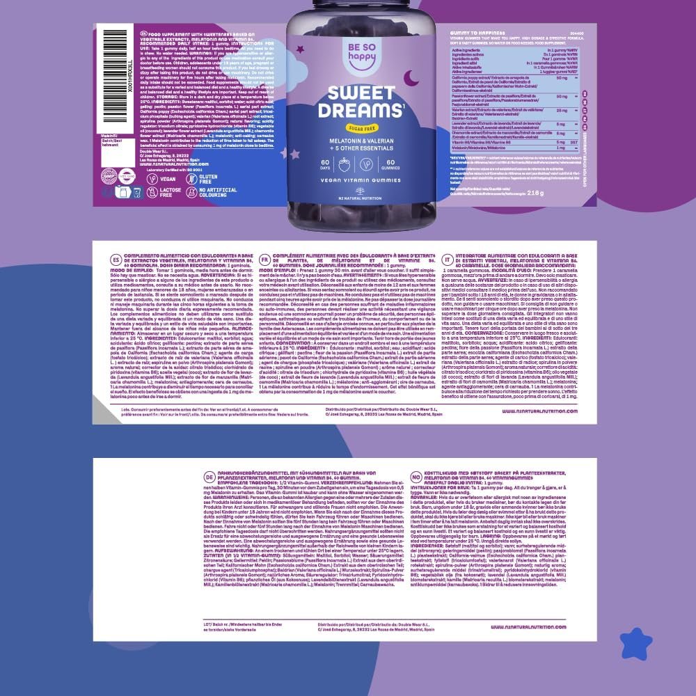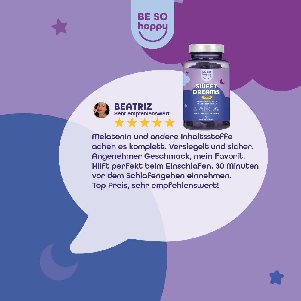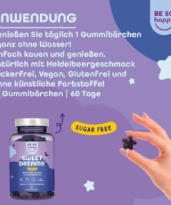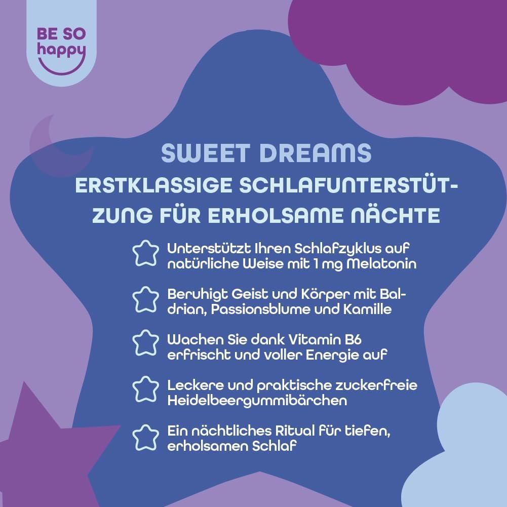 BeSoHappy Sweet Dreams sunt jeleuri vegane cu aroma de afine, concepute ca suplimente pentru somn. Fiecare jeleu contine 0,5 mg melatonina, extracte de valeriana, floare-pasiune, musetel, lavanda si vitamina B6 pentru relaxare profunda si somn odihnitor. Fara gluten, lactoza sau zahar adaugat – ideale ca pastile pentru dormit sub forma de jeleu. Se recomanda ½ jeleu inainte de culcare.