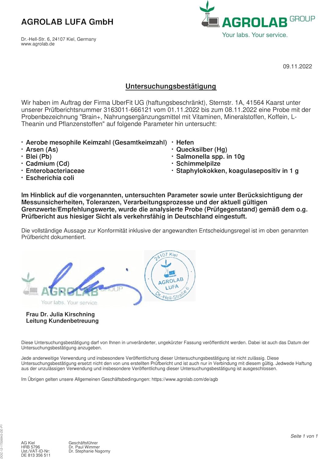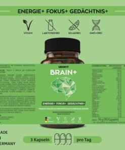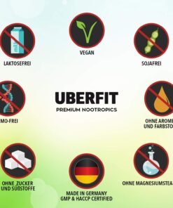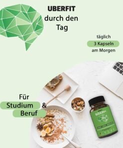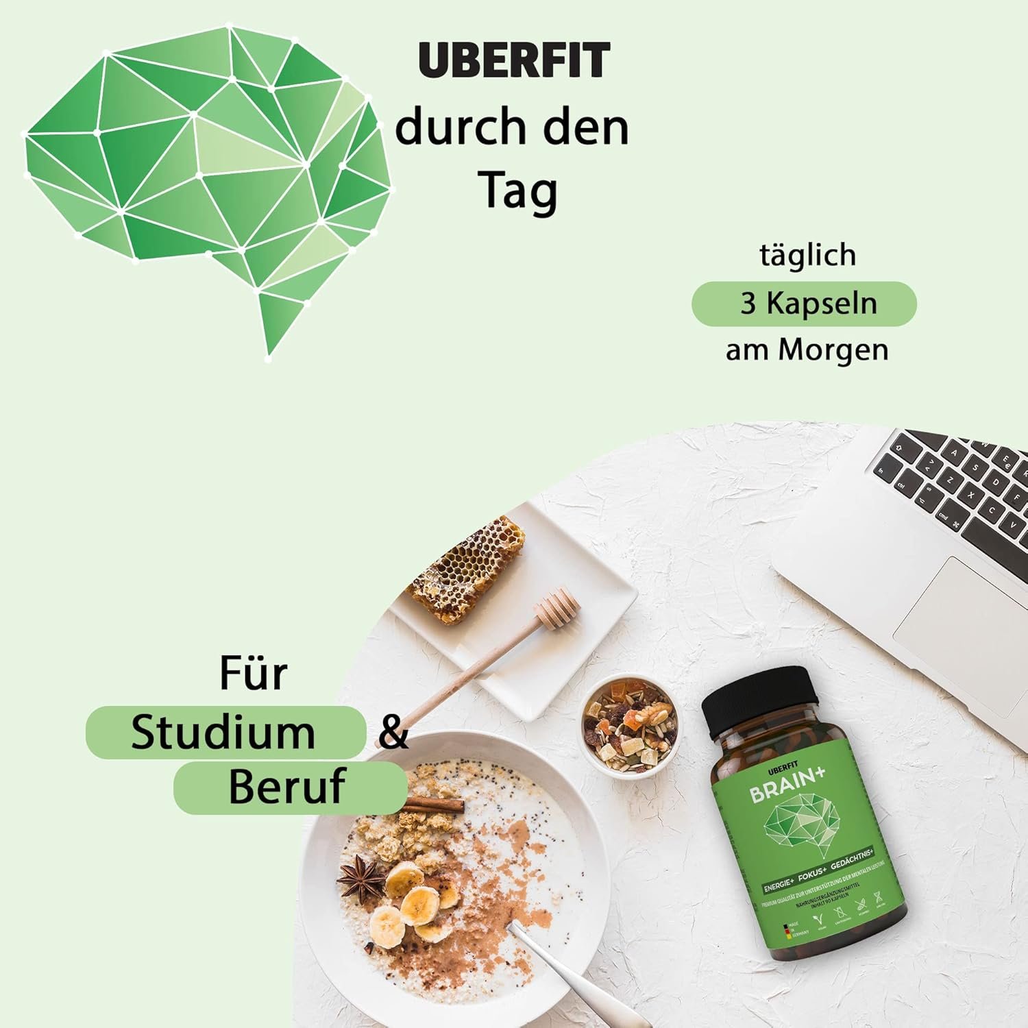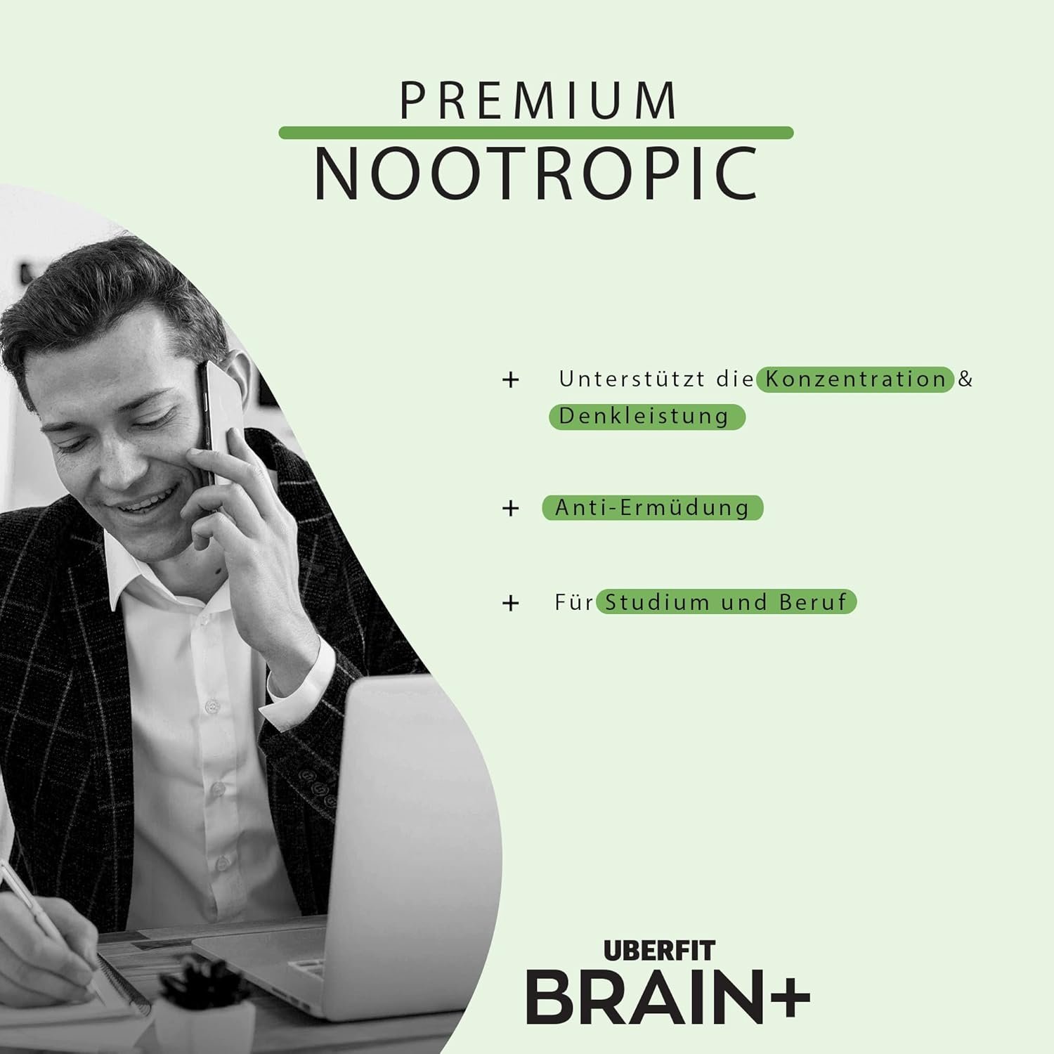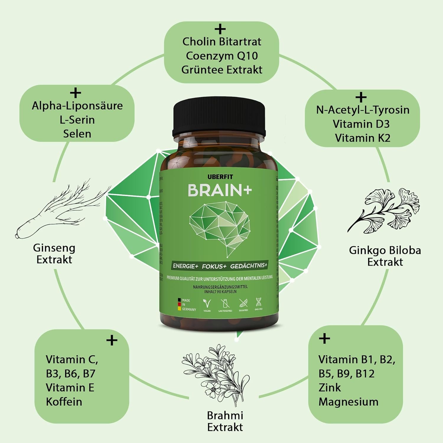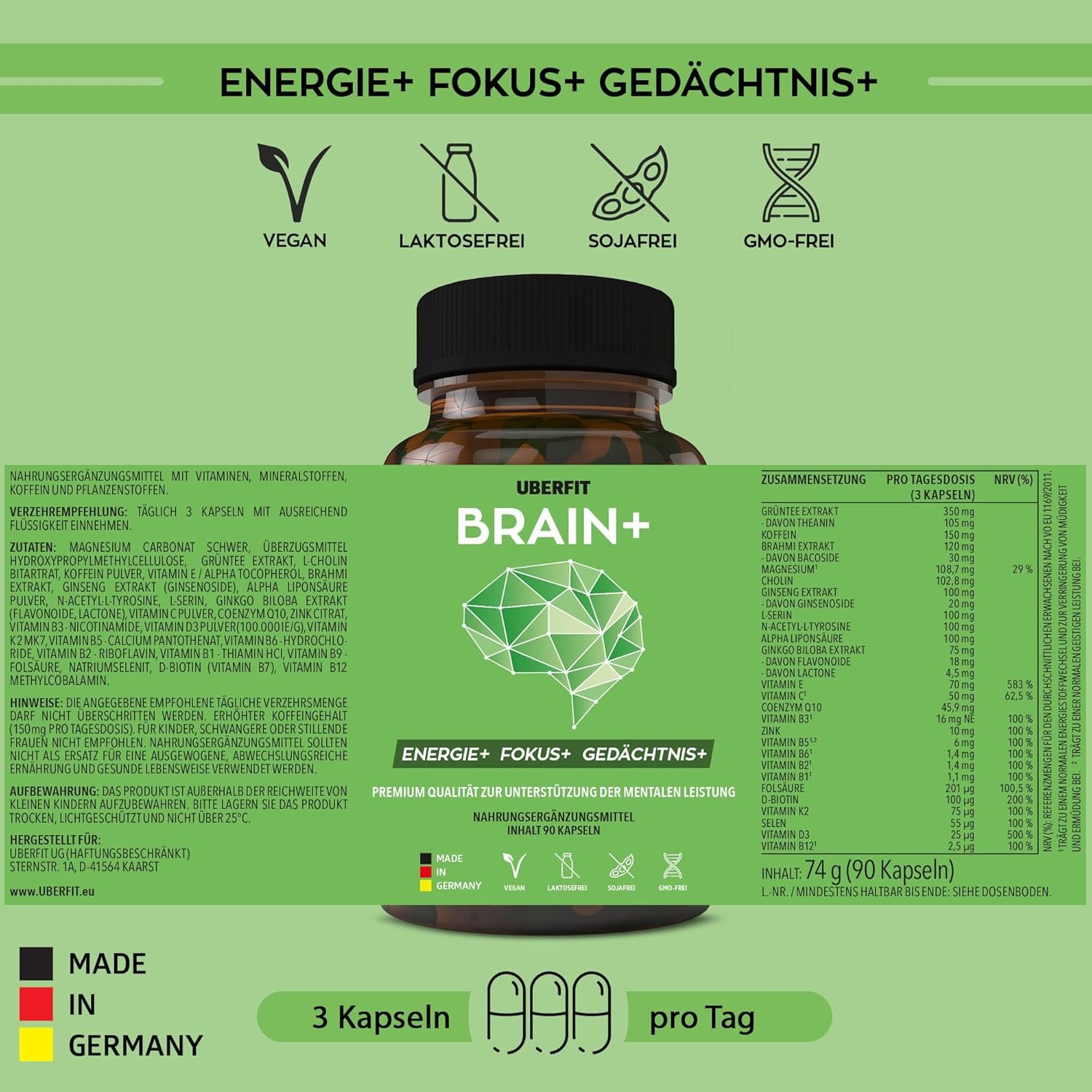 Uberfit Brain+ este un nootropic avansat din Germania cu o formulă completă, creată de nutriționiști pentru a susține memoria, focalizarea și energia mentală. Include 22 ingrediente de top: Bacopa Monnieri, Ginseng, Ginkgo, cholină, L‑theanină, co‑enzima Q10, cafeină (~150 mg/3 capsule) și un complex de vitamine B1–B6, B12, C, D3 plus zinc și magneziu. Fără lactoză, gluten sau aditivi artificiali – un veritabil nootropic complet pentru stimularea cognitivă și claritate mentală naturală.