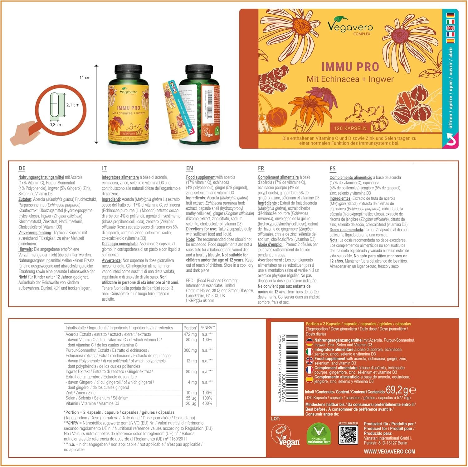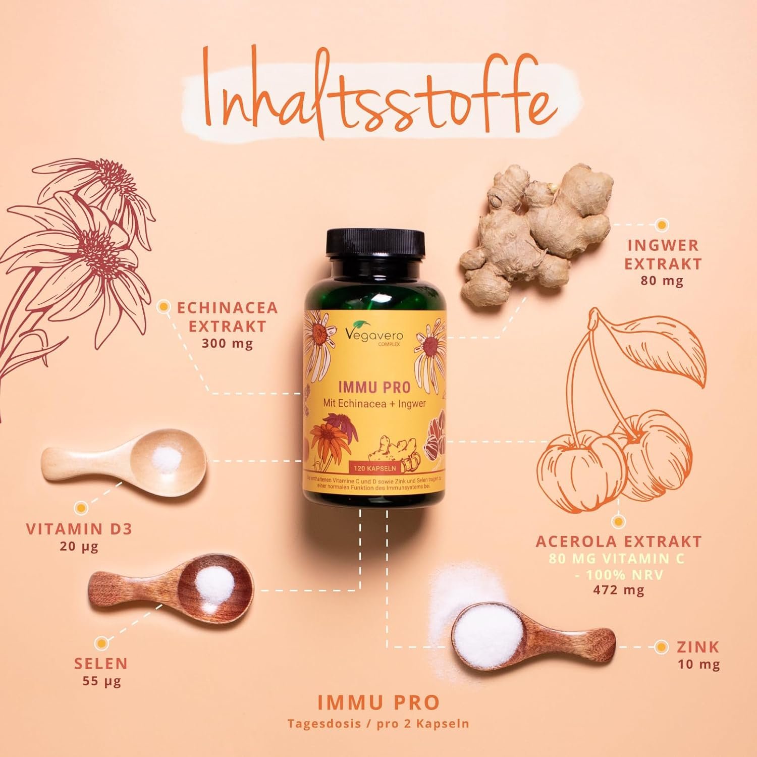 Ingrediente: Acerola (Malpighia glabra) extract de fruct (vitamina C), Echinacea purpurea extract de plantă (4 % polifenoli), capsule HPMC, extract de ghimbir (Zingiber officinale), zinc citrate, sodium selenite, cholecalciferol (vitamina D3) .