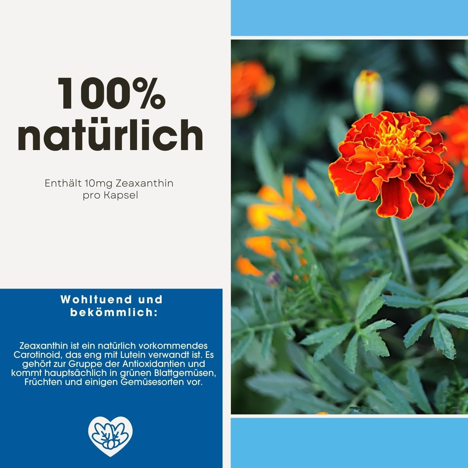 Zeaxantina este o substanță vegetală secundară care apare în mod natural în florile de Tagetes erecta L. și este unul dintre cei mai importanți carotenoizi. Extractul utilizat conține 20% zeaxantină sub formă de beadlets, pentru o dozare precisă și stabilitate optimă.